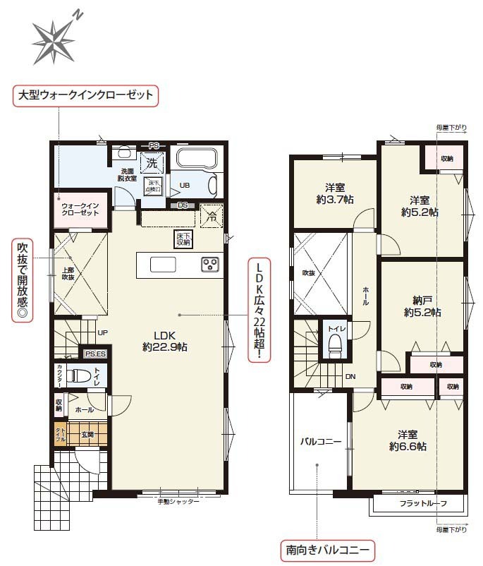 | 間取り詳細 | (1F)LDK22.9、(2F)洋6.6、(2F)洋5.2、(2F)洋3.7、(2F)S5.2 |