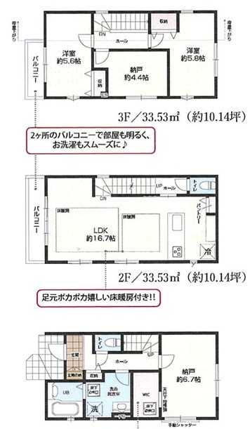 | 間取り詳細 | (2F)LDK16.7、(1F)S6.7、(3F)洋5.6、(3F)S5.8、(3F)S4.4 |