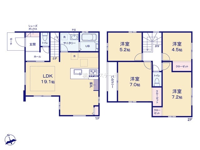 | 間取り詳細 | (1F)LDK19.1、(2F)洋5.2、(2F)洋4.5、(2F)洋7、(2F)洋7.2 |