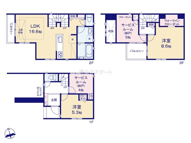 | 間取り詳細 | (2F)LDK16.6、(1F)S4、(1F)洋5.3、(3F)S5、(3F)洋8.6 |