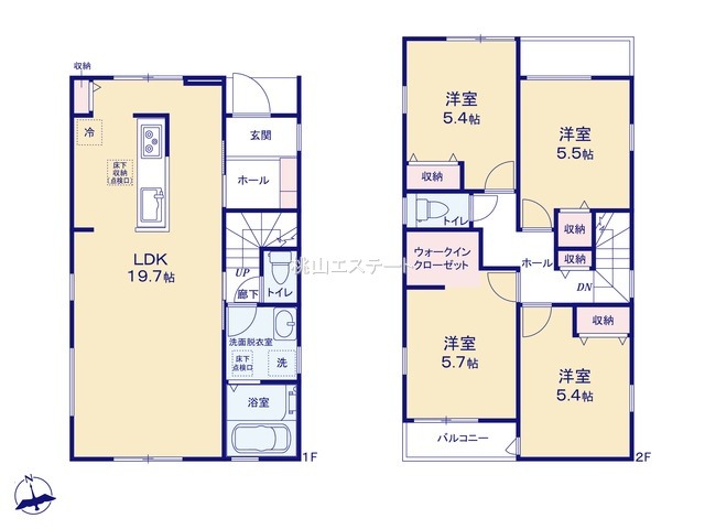 | 間取り詳細 | (1F)LDK19.7、(2F)洋5.4、(2F)洋5.5、(2F)洋5.7、(2F)洋5.4 |