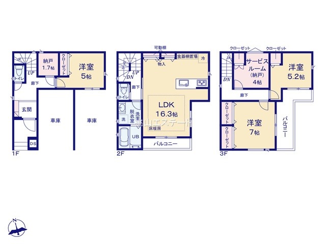 | 間取り詳細 | (2F)LDK16.2、(1F)洋7.2、(3F)洋5.2、(2F)洋4、(3F)洋8 |